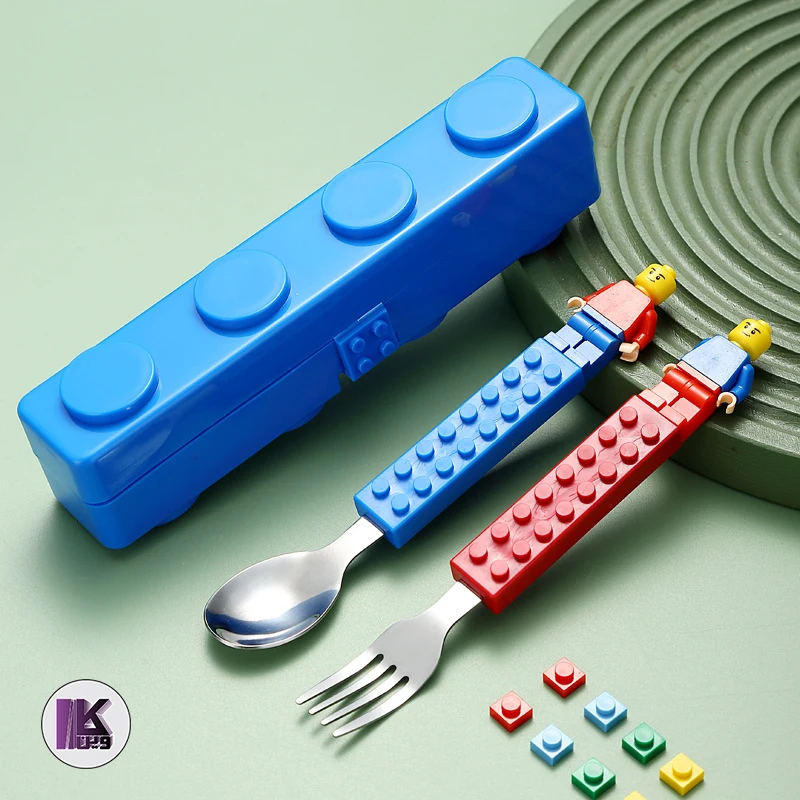 تصویری از ست قاشق و چنگال کودک با طرح لگو آبی و قرمز